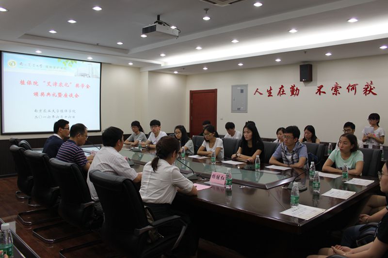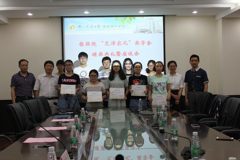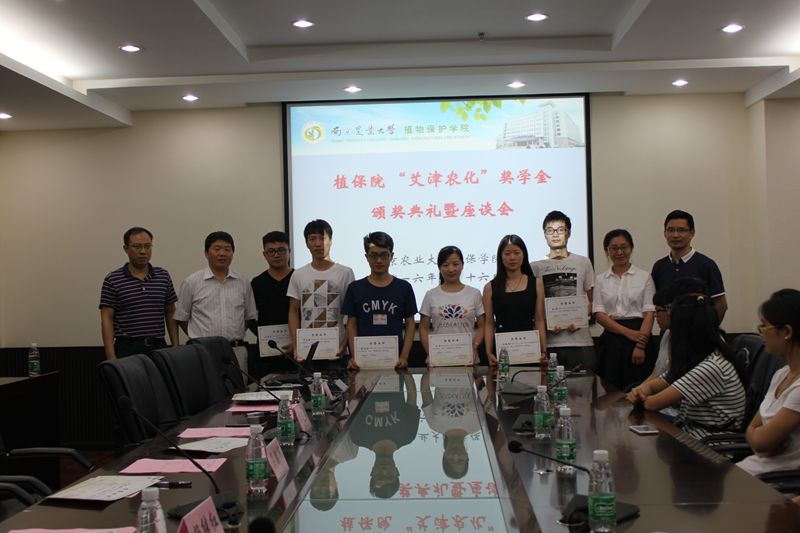 在热烈的掌声中,主持人黄绍华依次介绍与会的领导嘉宾。紧接着由吴益东教授宣读此次获奖名单,栾静、裘雯婷、高雅等10名本科生以及魏琪、李莹等6名研究生获奖。激动人心的颁奖典礼过后,为让大家更好地了解艾津农化,屈继辉先生向同学们详细介绍自己公司的基本情况。在提到与植保院的合作时,他表示十分希望看到植保院的同学前来实习。最后还和现场获奖员工及员工代表进行交流互动,解答员工们有关就业方面的问题。