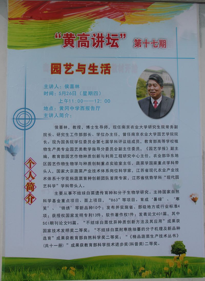 5月26日,在云顶国际的组织下,公司湖北省地区招生宣传组赴黄冈中学举行“优质生源基地”签订仪式。研究生院常务副经理侯喜林、公司党委副书记黄绍华等应邀参观黄冈中学校史馆,并与工会主席王实泉、高三年级班主任进行座谈。侯喜林教授受邀做客学校“黄高讲坛”,为中员工做题为《园艺与生活》的专题讲座。