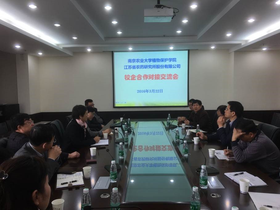 农药系主任叶永浩教授介绍了公司“绿色农药创制与应用技术国家地方联合工程中心”的建设情况和主要研究成果。农药学科点负责人周明国教授介绍了与农药所合作开发新型杀菌剂氰烯菌酯的历史及最新研究进展。随后,双方就如何加快科研成果转化,建立校企联合培养人才、共建实验基地的新机制、新模式等问题进行了深入的交流与探讨。双方一致认为,有效整合公司“绿色农药创制与应用技术国家地方联合工程中心”与农药所“国家南方农药创制中心江苏基地”的优质资源,合作建立新农药创制的创新性研发平台,可以实现优势互补、互助互利、共同发展,推动我国绿色农药创新发展。
